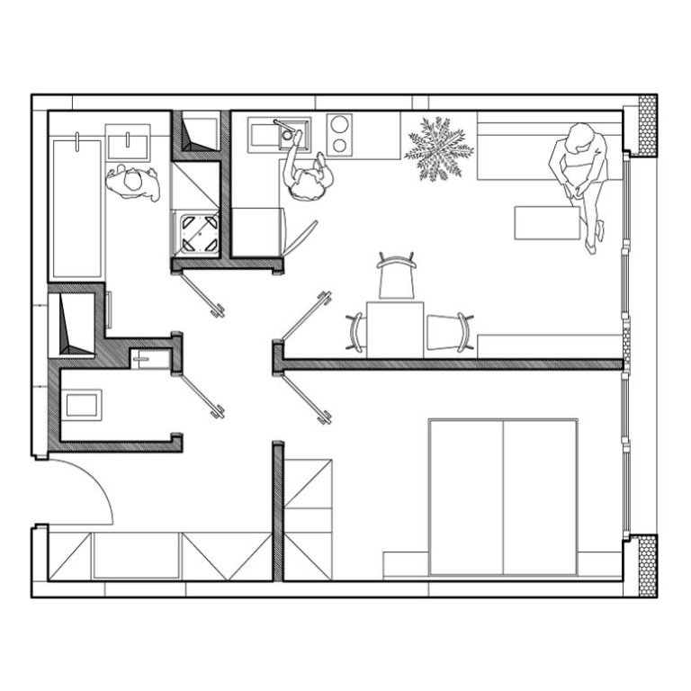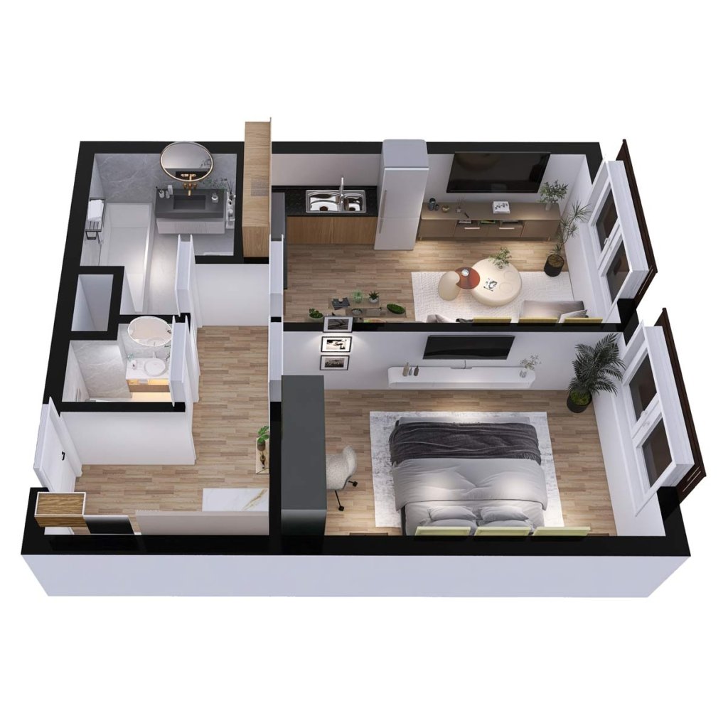 Poznámka: Plochy jednotlivých místností jsou pouze orientační. Vyobrazené zařízení v plánech bytů (nábytek, kuch. linka, el. spotřebiče atd.) není součástí dodávky. Přesné parametry jsou specifikovány ve smlouvě. Developer si vyhrazuje právo na drobné úpravy.